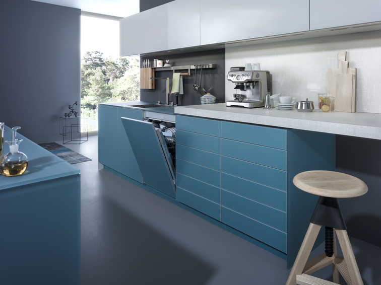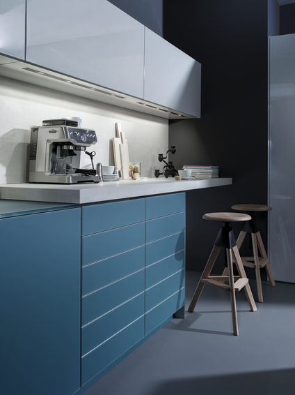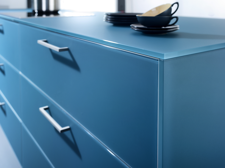 Это современное и молодое сочетание цветов и материалов с матовым стеклом и глянцевым лаком, приглушенный сине-зеленый и светло-серый привносит в комнату свежее и освежающее настроение.