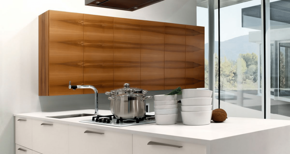 Модель, позволяющая проектировать пространство кухни благодаря уникальному рисунку непрерывных горизонтальных линий натурального дерева на фасадах