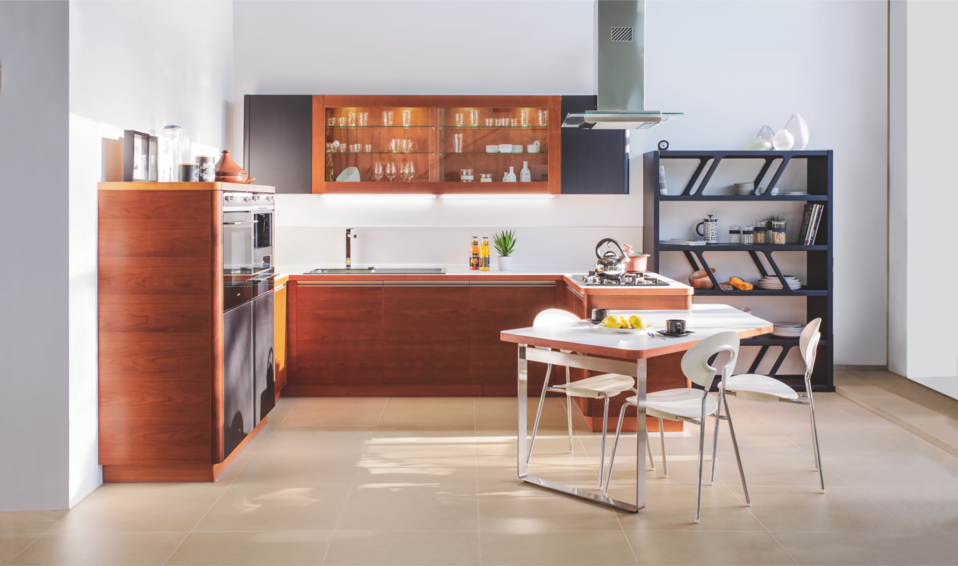 Теплый оттенок шпона натуральной вишни и последовательный рисунок от фасада к фасаду, придают помещению атмосферу невероятного тепла и уюта