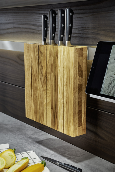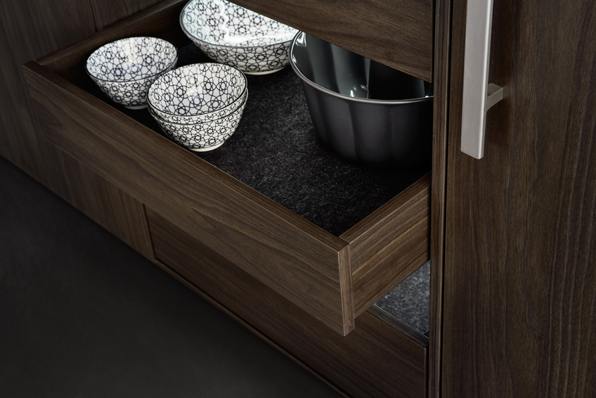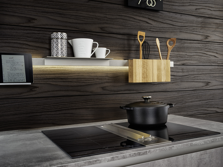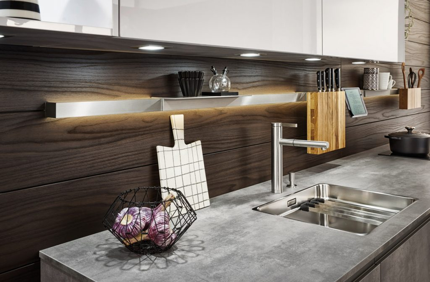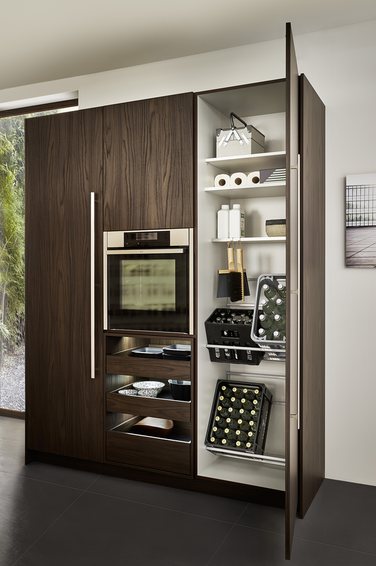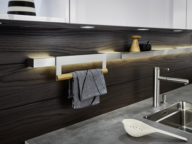 Кухня SIRIUS | IKONO | SYNTHIA демонстрирует все самые актуальные разработки немецкой фабрики LEICHT для планирования открытой кухни-гостиной. Связующим звеном в данной композиции выступает стена, полностью обшитая стеновыми панелями. В отличии от аналогов для крепления данных панелей не нужно возводить дополнительные несущие конструкции, они просто клеятся на стену. Визуальное объединение пространства реализовано за счет используемых фактур. Фасады высоких колонн и панели изготовлены из структурированного ламината с фактурой темного ореха, нижние шкафы – с имитацией бетона. Глянцевые лаковые поверхности выполнены в арктическом белом цвете. В зоне кухонного фартука находится рейлинговая система MODO со встроенной подсветкой, здесь можно хранить масла, специи, кухонные инструменты и т.д. В навесные шкафы встроены открытые ниши с LED-светильниками. Высокие колонны облегчены за счет открытых выдвижных ящиков. В данной модели использовано несколько систем открывания: от нажатия, интегрированные ручки и ручки-рейлинги. Внутреннее пространство четко структурировано за счет контейнеров, вставок и разделителей. Для хранения крупногабаритных предметов, например для ящиков с напитками, предусмотрены специальные держатели.