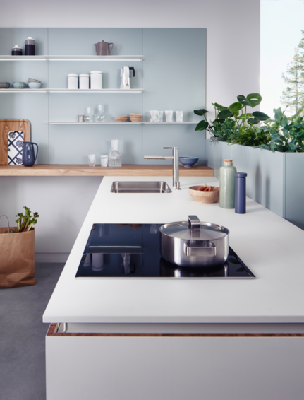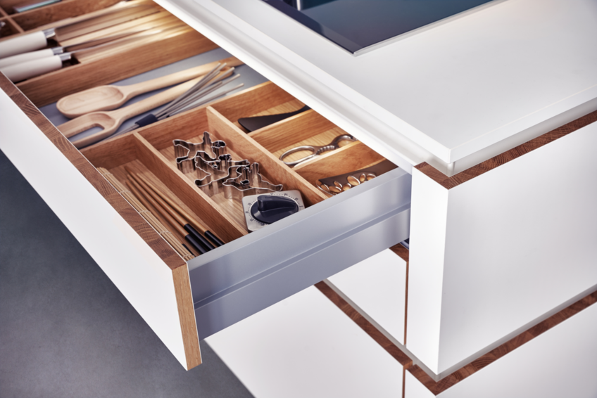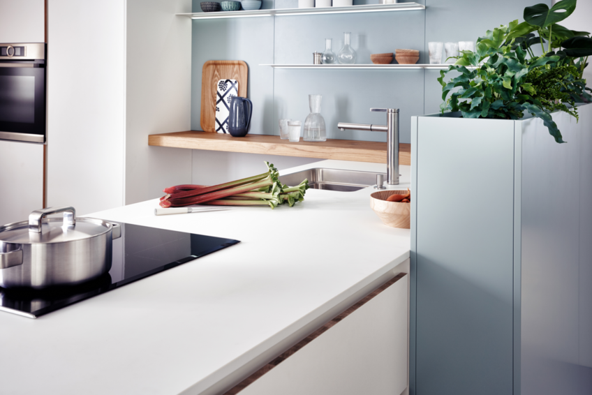Кухня LEICHT SOLID-C | VALAIS | CLASSIC-FS объединила в себе сразу несколько мировых трендов в кухонном интерьере. Во-первых, открытые элементы – супертонкие полки со встроенными LED-светильниками – не только «смягчили» строгие минималистичные формы, но и позволили наиболее оптимально интегрировать кухню в жилое пространство. Стремление к натуральному и простому – мегатренд последних лет воплотился в новой программе фасадов SOLID. Шпонированный кант создает контрастное сочетание с лицевой частью фронта, выполненной из ламината белого оттенка. Данный тренд также нашел свое отражение и в стеновых панелях VALAIS с отделкой из шпона альпийского дуба. Ниша для цветов и часть стеновых панелей выполнены в программе CLASSIC-FS, матовый лак, оттенок NCS S 3005-B80G. Интегрированный в стену стол заменил отдельно стоящую обеденную группу, что позволило сэкономить пространство и достичь визуального единства композиции. Дополнительная посадочная зона в рабочей части создана за счет деревянной барной столешницы. Ящики и шкафы открываются за счет безручечной системы открывания CONTINO.