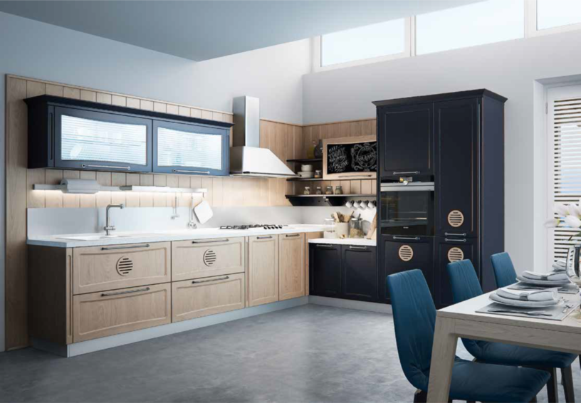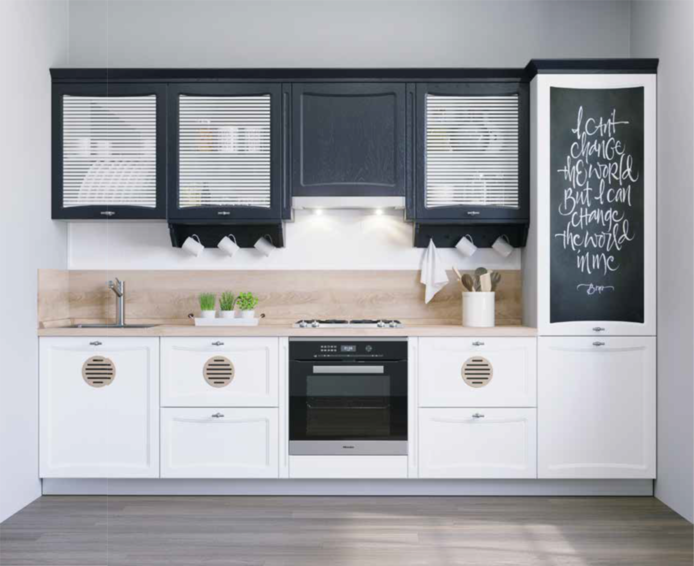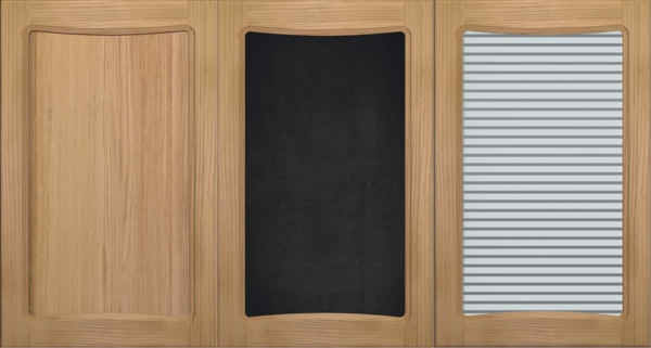 Варианты фасадов: глухой или со стеклом. Рамка из массива дуба со вставкой из МДФ, покрытой шпоном дуба. На фасадах с витражом узор нанесен методом цифровой печати.