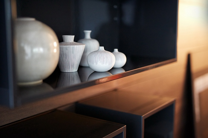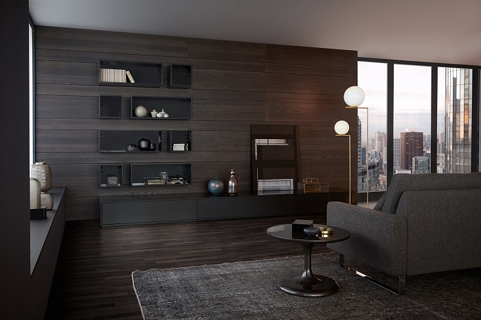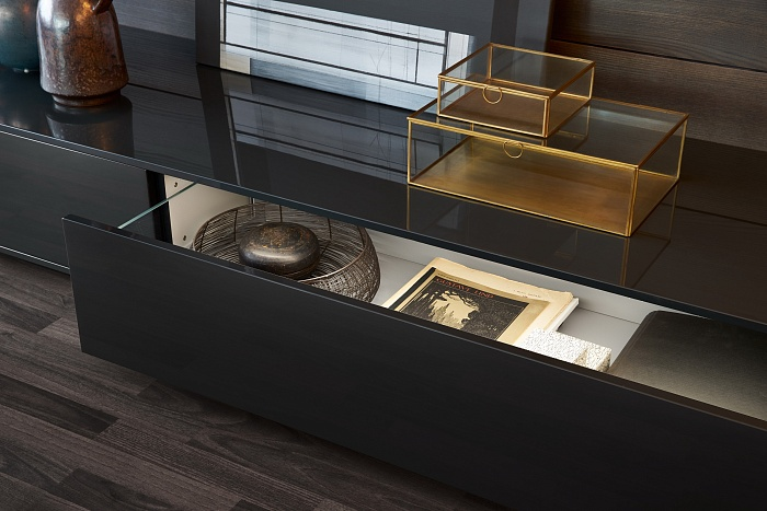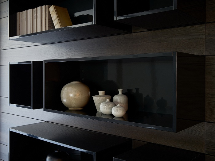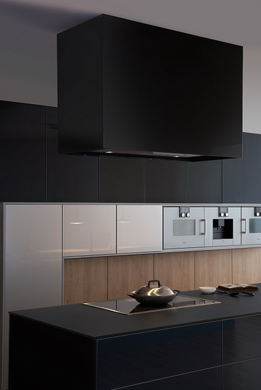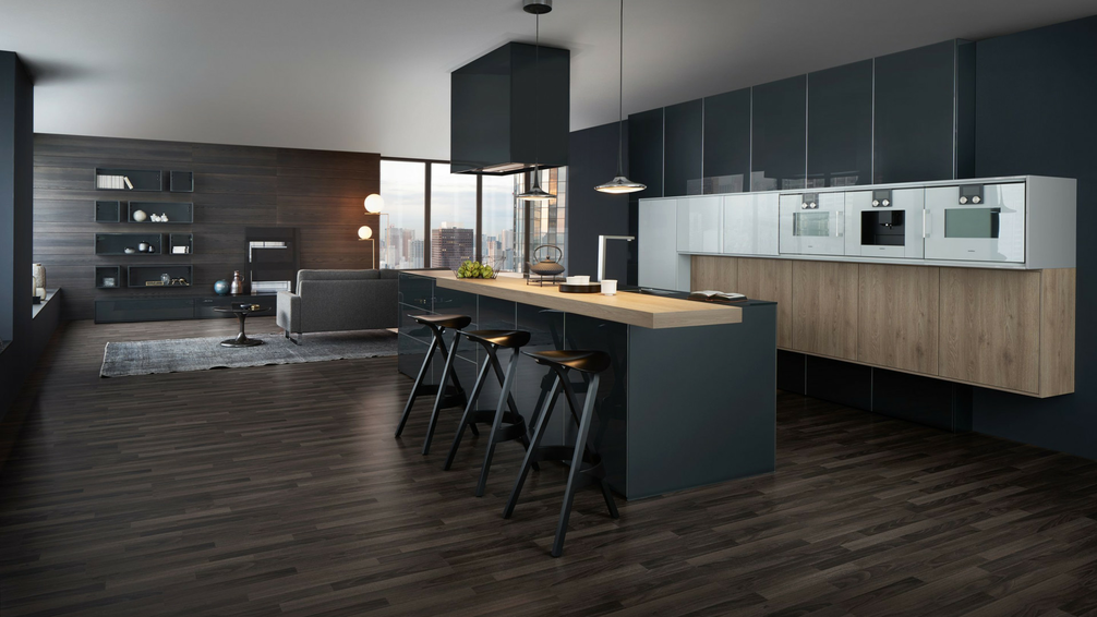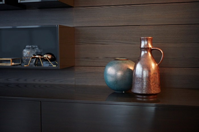 Дерево, стекло и лак – смелое и утонченное сочетание в одной кухне трех абсолютно разных по своим характеристикам материалов. Объединяет их общая, точно выверенная композиция.
