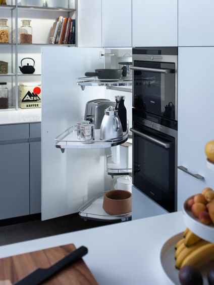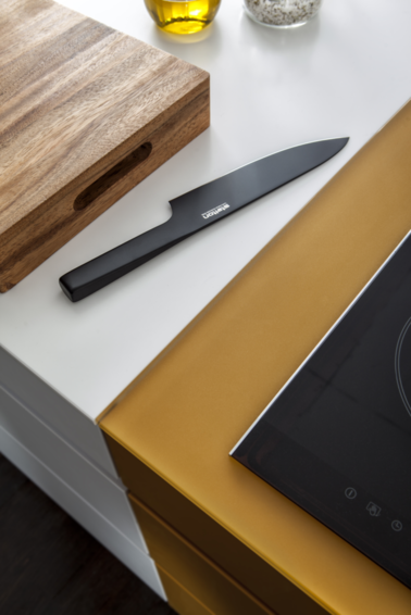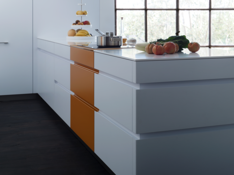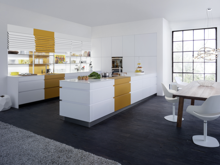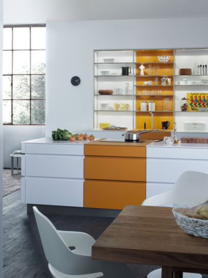 Модель кухни TOCCO | TOCCO-C | CLASSIC-FS-A совместила в себе лучшие традиции ретро-стиля и последние инновационные разработки компании Leicht. Гармоничные пропорции, четкие линии, скрытые элементы мебели создают в помещении атмосферу легкости и простора. Фасады гарнитура имеют матовую белую поверхность, зона вокруг варочной плиты и мойки отделана матовыми фронтами в ретро-цвете "куркума". По желанию клиента, данные зоны также могут быть выполнены в ретро-цветах "петрол" и "шафран". Кухонный гарнитур TOCCO | TOCCO-C | CLASSIC-FS-A включает кухонный полуостров, напольные шкафы, металлический стеллаж и монтируемый в стену напольный модуль. Самым ярким элементом кухни является металлический стеллаж со встроенной системой освещения. Высота полок регулируется. По желанию стеллаж может быть закрыт инновационной системой жалюзи XTEND+. Рабочие поверхности гарнитура комплектуются тонкими износостойкими столешницами. Высокий напольный модуль со встроенной электротехникой монтируется непосредственно в стену, образуя ровную и гладкую поверхность. Дверные ручки отсутствуют, открытие осуществляется благодаря эргономичным ручкам-впадинам и от нажатия.