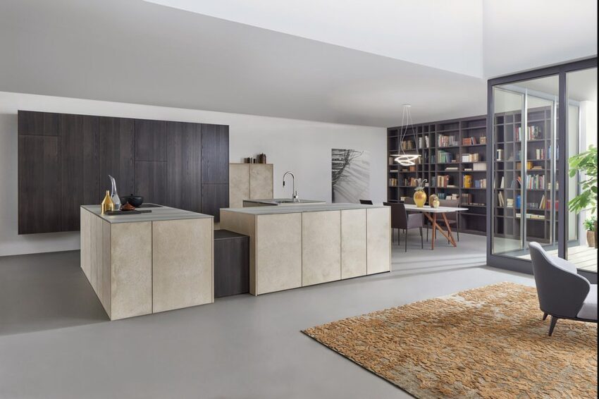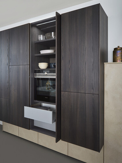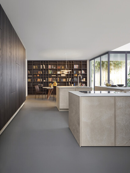 Новое видение природных материалов. Комбинация поверхностей из песчаника и шпона темного дерева придает кухне уникальную ценность, как теплое сияние - с очень тонкими, слегка «дымчатыми» нотами. Такое же значение имеет интерьер. Вместо стандартного монолитного острова, он разделен на три функциональные зоны. Отдельные модули - подготовка продуктов, мокрая зона и зона приготовления пищи - могут быть размещены в любом месте в пространстве.