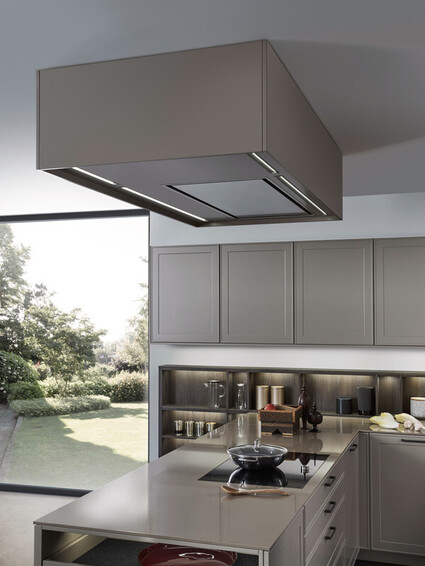 Эмоционально привлекательная, неподвластная времени элегантная кухонная атмосфера характеризуется матово лакированными рамочными фронтами, которые выдержаны в теплом тоне Умбра из цветовой гаммы Les Couleurs® Le Corbusier. Комфортно и приглашающе выглядит парапет из характерного натурального дерева со встроенной скамьей.