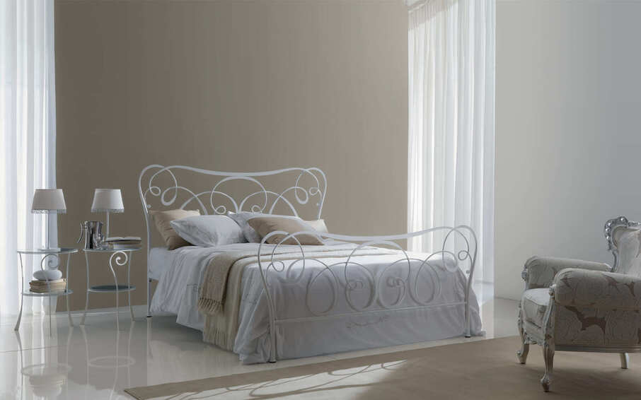 Кровать из лакированного или патинированного вручную железа, двуспальная версия, с изножьем, каркасом или контейнером. Доступен в размерах: 184х208х126/82 184х200х126 184х214х126