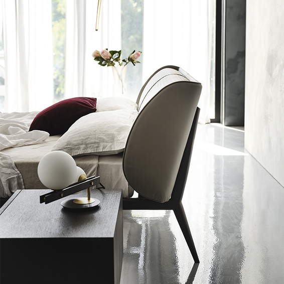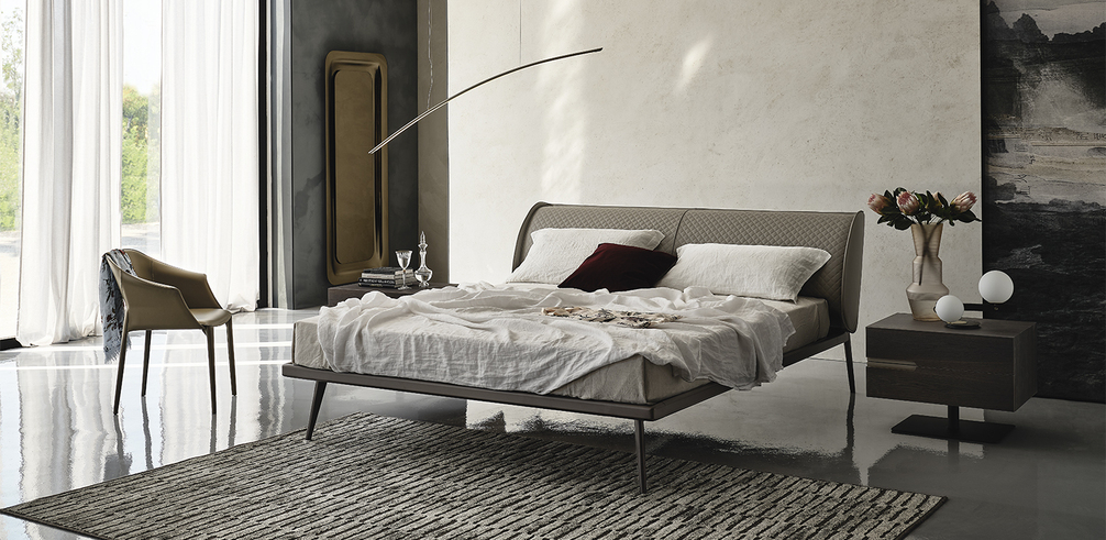 Ayrton (Кровать с каркасом из лакированной стали с тиснением под титан (GFM11) или бронзу (GFM18). Изголовье полностью покрыто тканью, синтетическим нубуком, микронубуком, синтетической кожей или мягкой кожей согласно образцу. Рейки включены.)