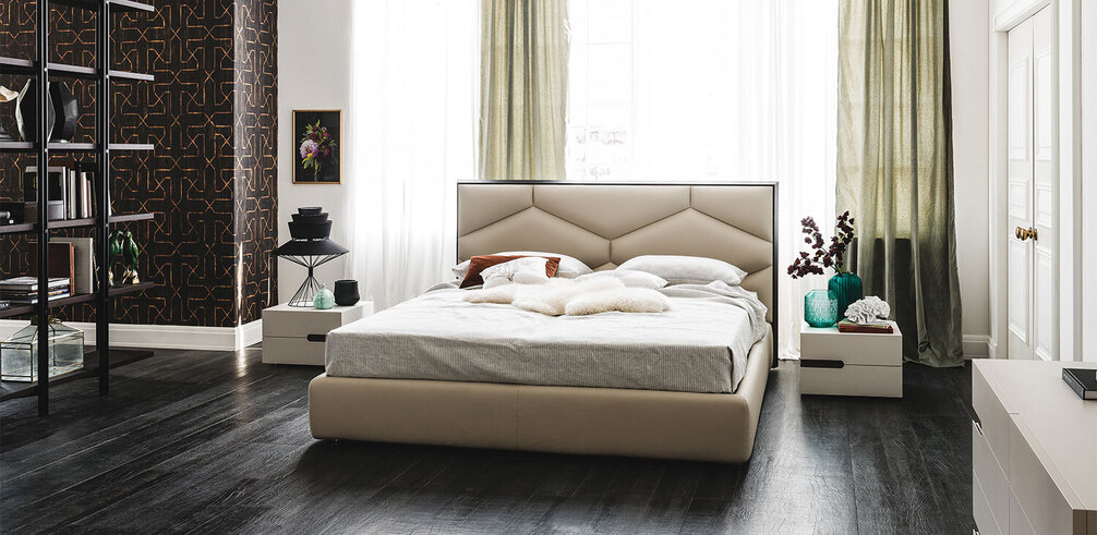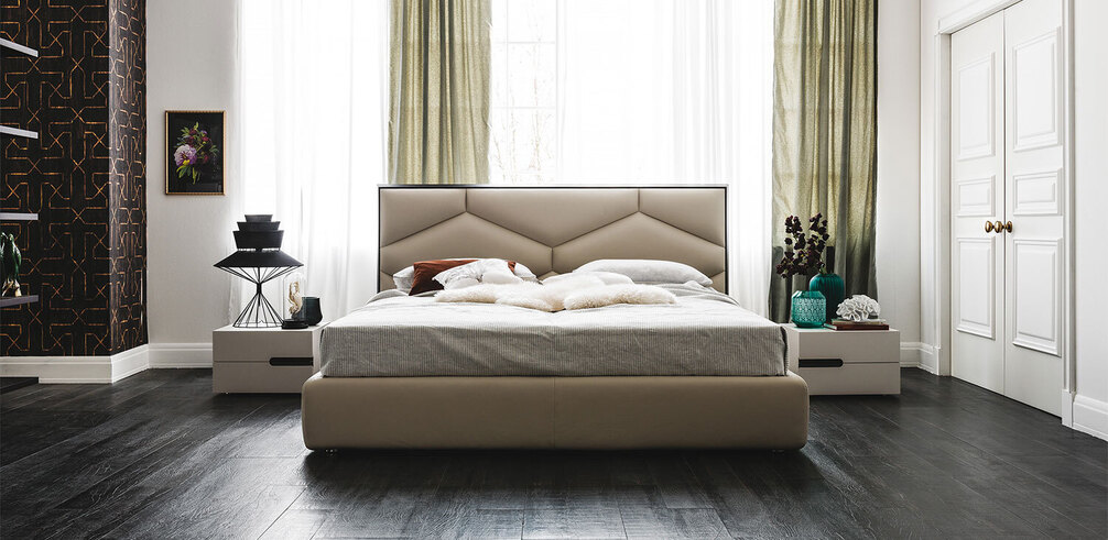 Edward (Кровать, полностью обитая тканью, синтетическим или микронубуком, мягкой или искусственной кожей цвета согласно образцам. Профиль изголовья в орехе (NC) или обожженном дубе (RB). Решетка включена. Дополнительно возможно заказать подъемный механизм.)