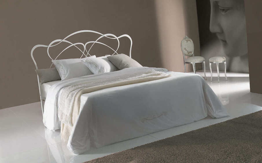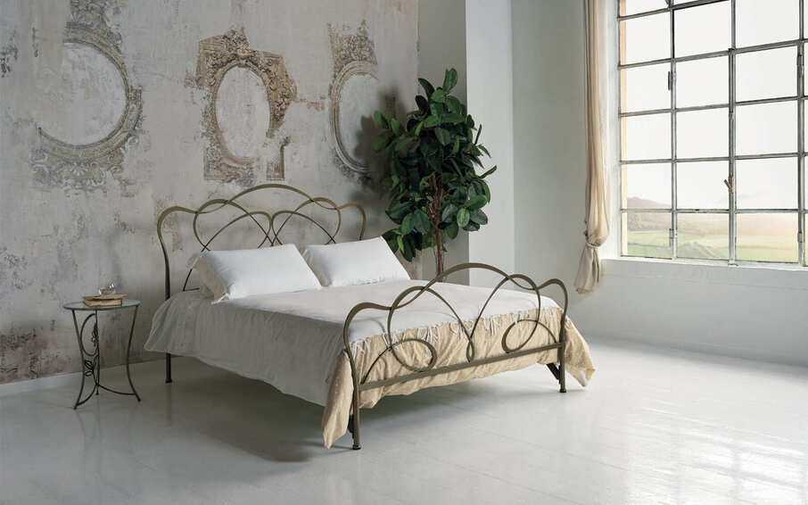 Кровать из лакированного или патинированного вручную железа, двуспальная версия, с изножьем, каркасом или контейнером. Доступен в размерах: 177х208х131/85 177х200х131 177х214х131