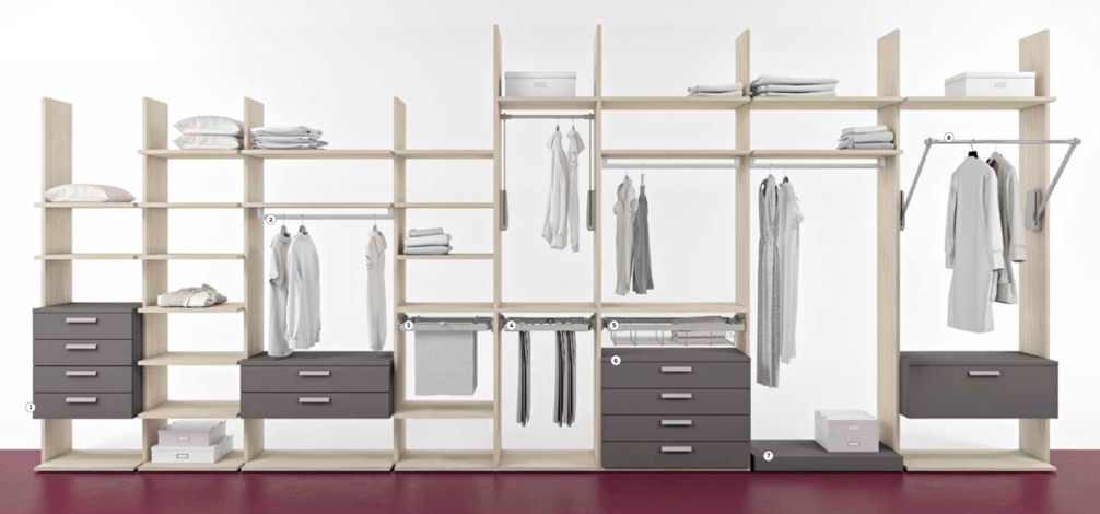 Наличие в доме гардеробной комнаты позволяет существенно сэкономить полезную площадь на шкафах, оптимизирует быт и позволяет быстро отыскать нужную вещь. С Colombini вы грамотно сможете обустроить себе гардеробную, расположить все отделы, полочки и ящики, чтобы вы легко могли разместить и достать свои вещи.