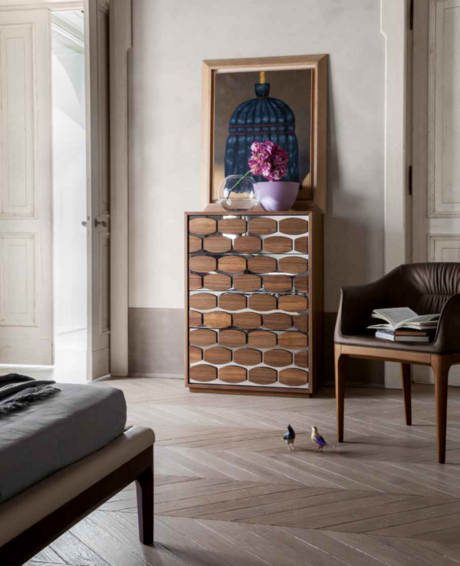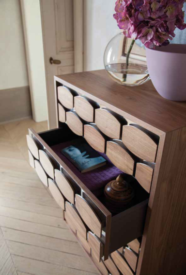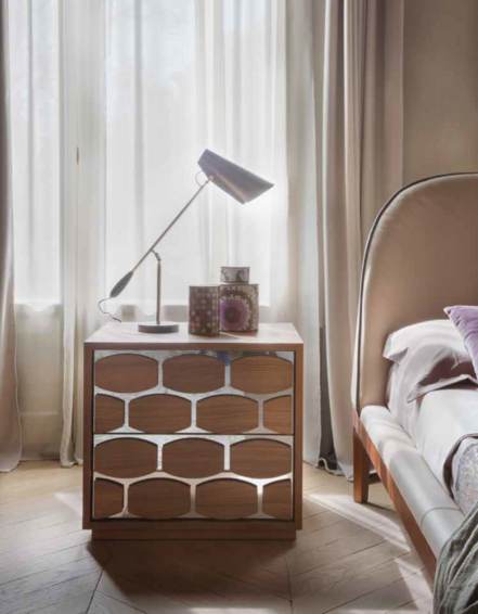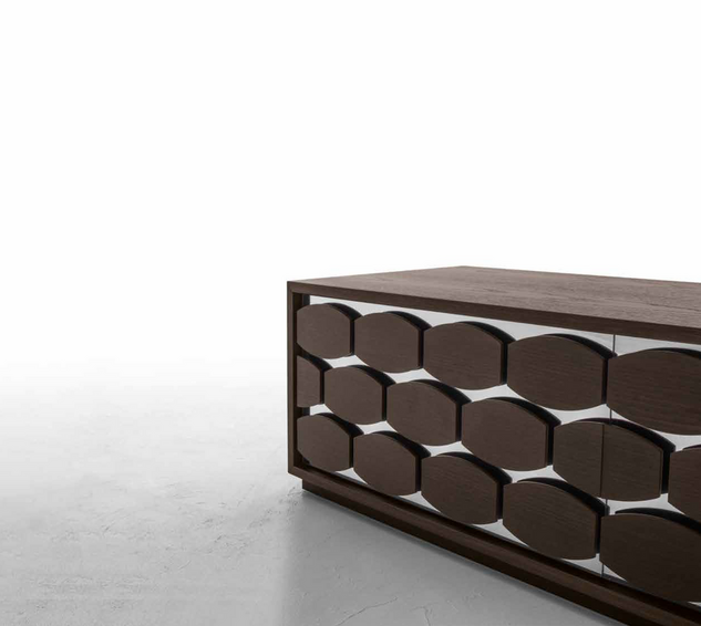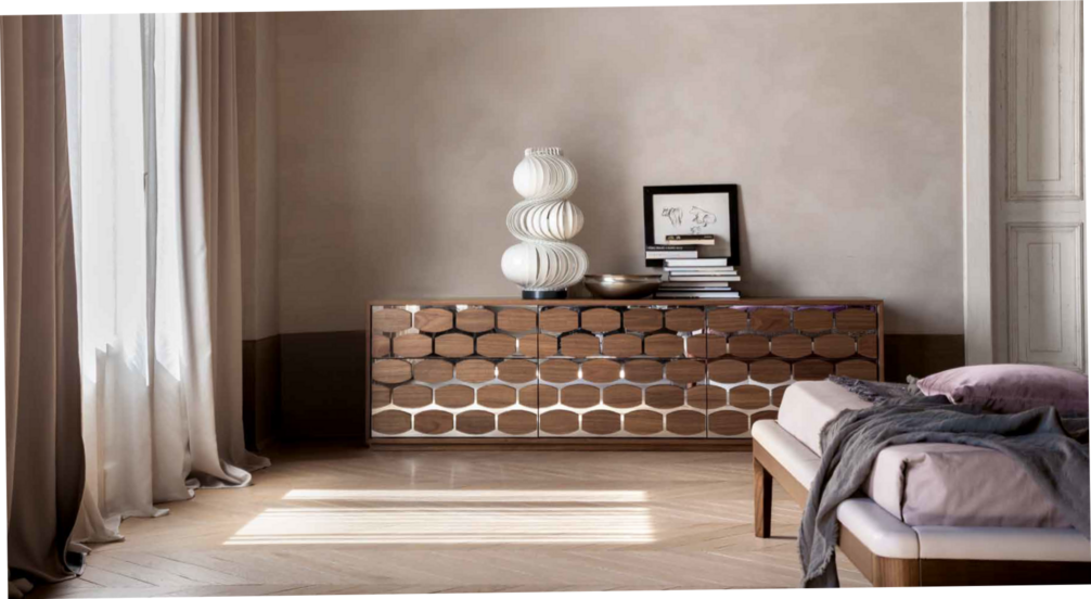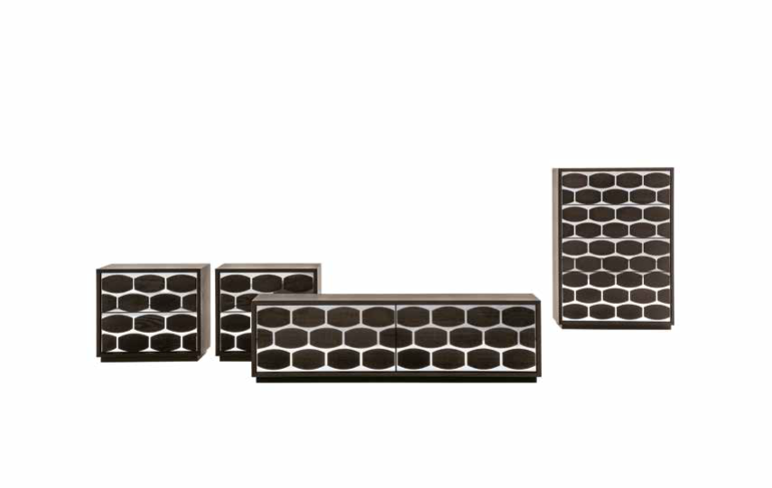 Это решение для интерьера, предназначенного для отдыха, в котором пространству и линиям отведена ключевая роль. Комод, тумбочка и низкая тумба с ящиками Honey Night поражают с первого взгляда сложностью комплексной обработки черного ореха и термообработанного темного дуба, а также удачным применением зеркал, способных зрительно расширить помещение.