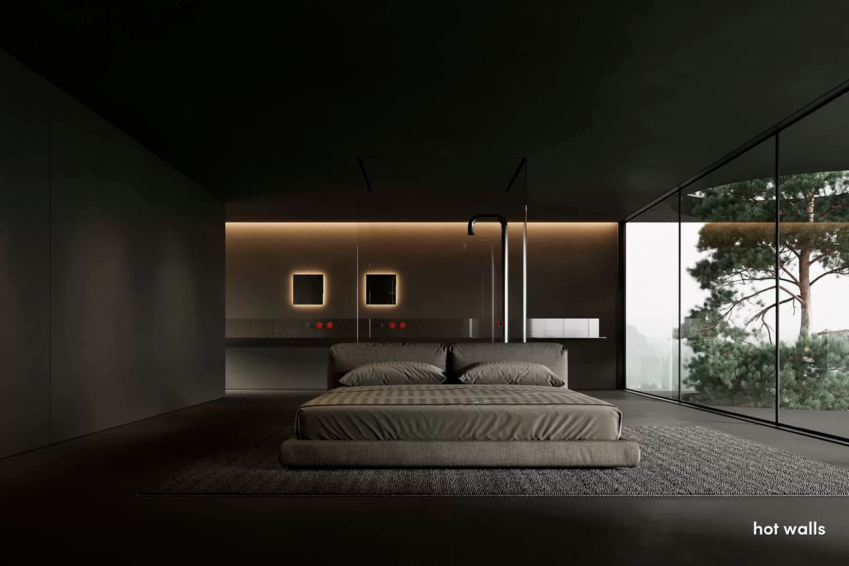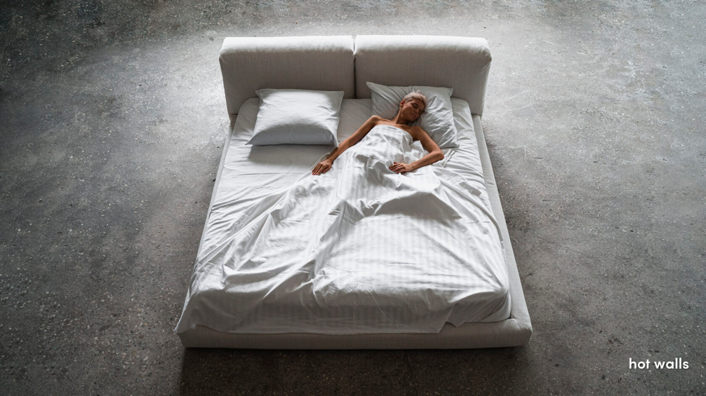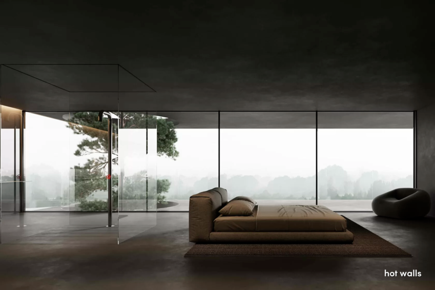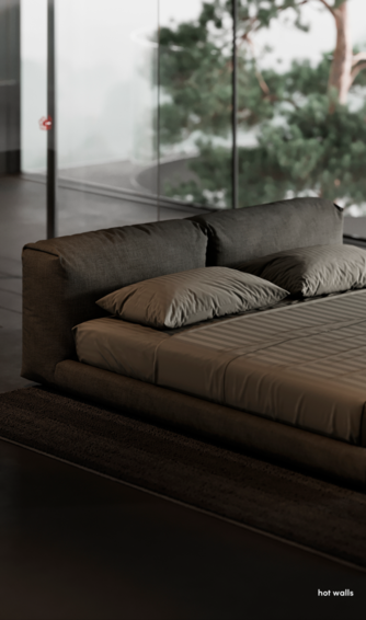 Низкая кровать Boca Soft с пухлым изголовьем и тонкими царгами от Boca Room.
