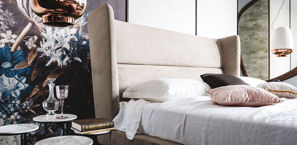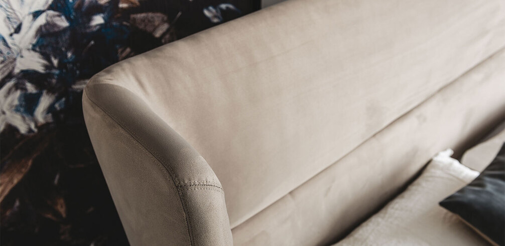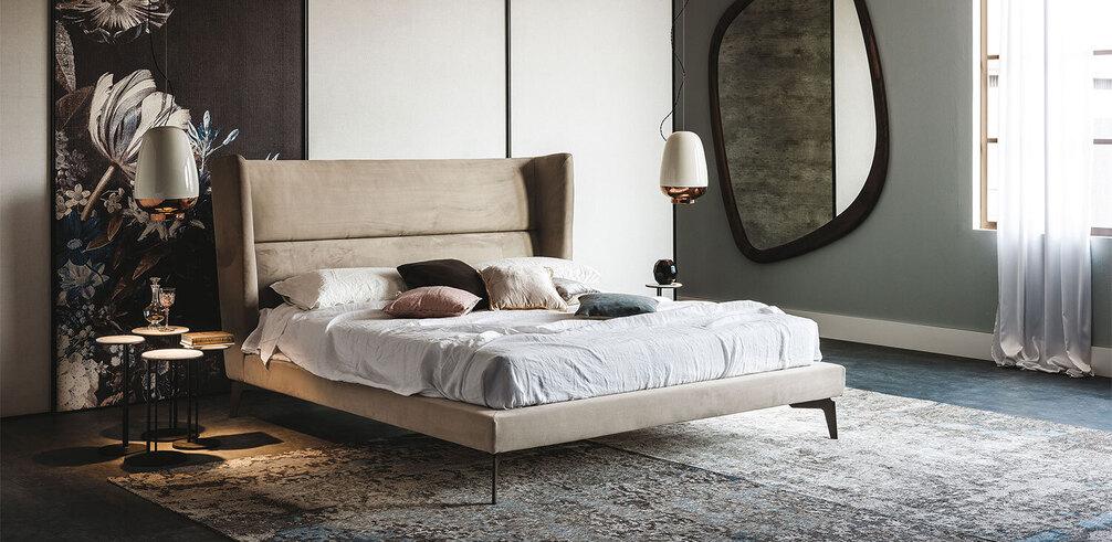 Ludovic (Мягкая кровать из ткани, натуральной или искутссвенной кожи, синтетическом или микронубуке. Ножки из стали, окрашенной в матовый бронзовый (OP15), гофрированный белый (GFM71) или графитовый (GFM69). Дополнительно возможно обить обратную сторону изголовья в мягкую кожу. Решетка включена.)
