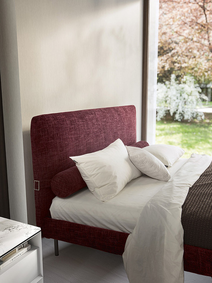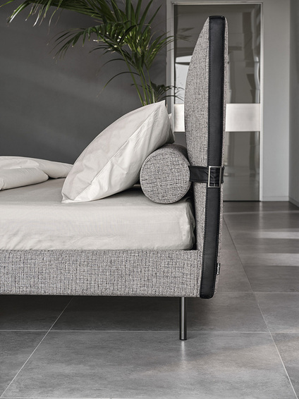Подголовник опоясывается декоративной лентой, которая может контрастировать с основанием, используя другой материал или отделку. Тонкие цилиндрические ножки поддерживают каркас кровати. Эта кровать с полностью съемными чехлами может быть выполнена из ткани или кожи.