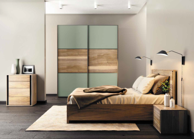Спальня MODERN — это единство традиций и технологических новаций, утонченная элегантность и сдержанный шик. Вертикальные интегрированные ручки на тумбах и комодах, аналогичные контрастные детали изголовья кровати, сочетание ламината, натурального шпона и окрашенных по вашему желанию элементов подчеркивают уникальность концептуальной идеи спальни.