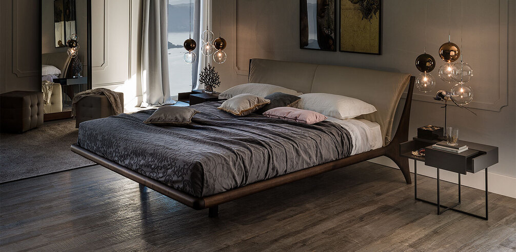 Nelson (Кровать с каркасом из ореха Canaletto (NC) или ясеня, окрашенного под обожженный дуб (frRB). Изголовье полностью обито в ткань, синтетический нубук, микронубук, натуральную или искусственную кожу цвета согласно образцам. Решетка включена.)
