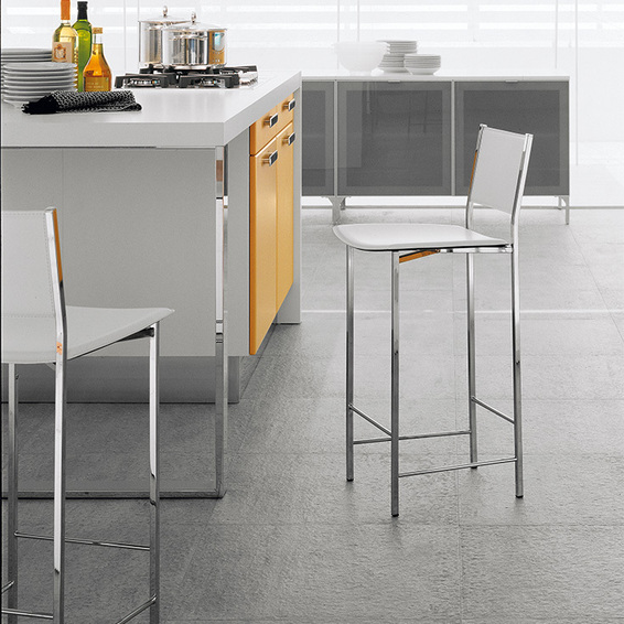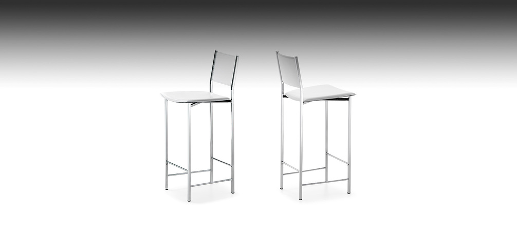 Табурет с каркасом из хромированной стали или черного хрома, черного, белого, окрашенного в графитовый цвет или лакированной стали с тиснением под титан. Спинка и сиденье обтянуты кожей согласно образцу карты. Стандартный шов. Представлен в размере: 38x45x90h