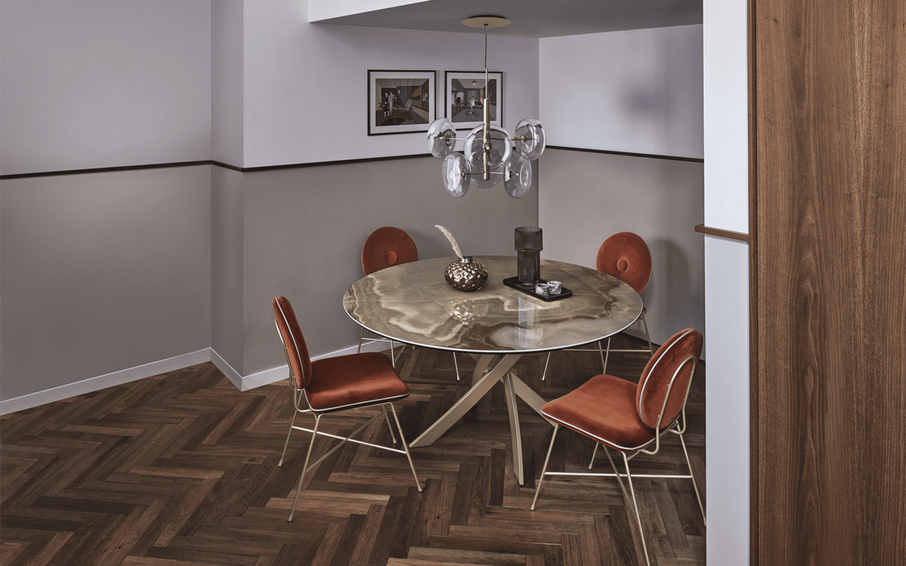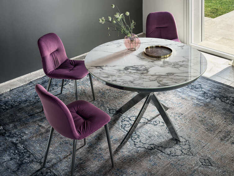 Круглый или эллиптический стол, фиксированный и раздвижной, со стальной конструкцией.