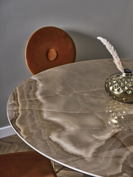 Столешница из шпонированного дерева, хрусталя, устойчивого к царапинам хрусталя или супермрамора и кольцевая столешница из шпонированного дерева с центральным утопленным вращающимся верхом из хрусталя, устойчивого к царапинам хрусталя и супермрамора. Доступен в размерах: 175х75х125 180х75х115 Ø 110х75 Ø 120х75 Ø 130х75 Ø 150х75 Ø 180х75