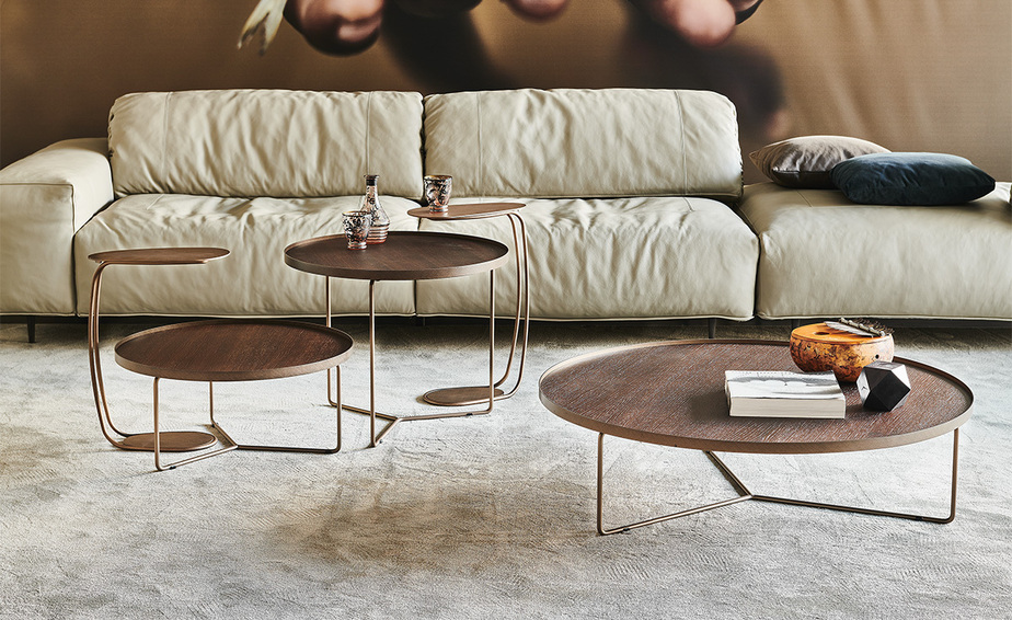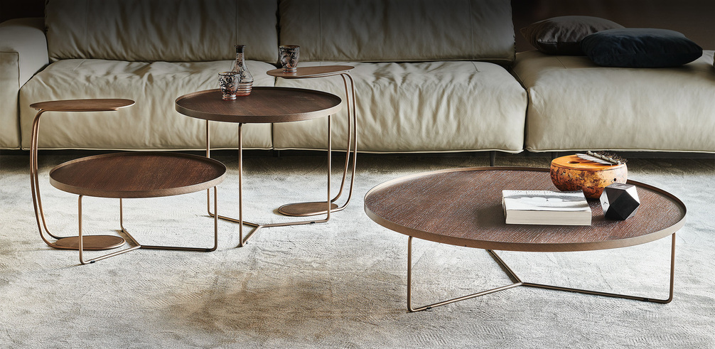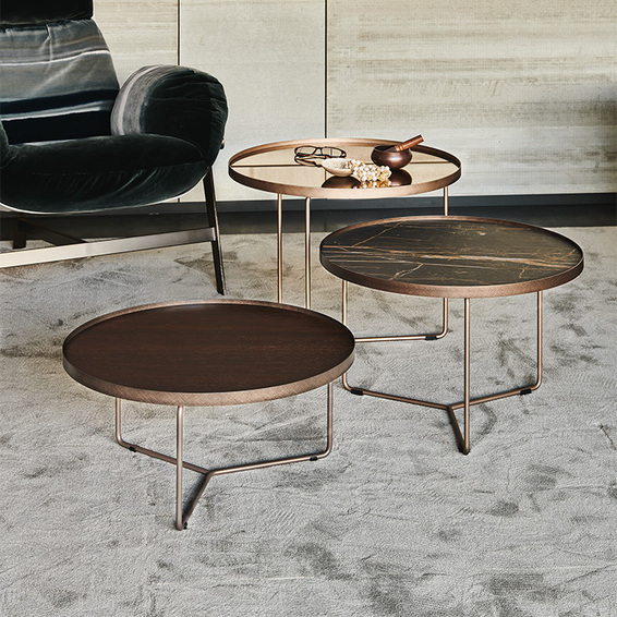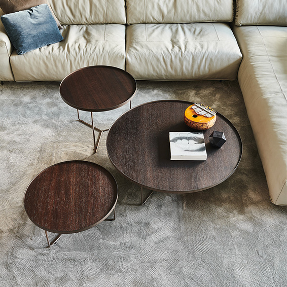 Журнальный столик с рамой из тисненого титана или черной лакированной стали или с основанием из бронзы и верхней рамой из матовой бронзы. Столешница из ореха Canaletto, обожженного дуба или натурального дуба. Доступен в круглой форме и в размерах: ø60x28h ø60x38h ø60x48h ø100x28h