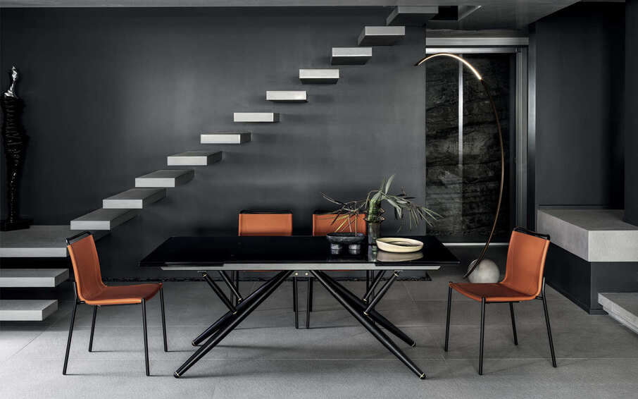 Прямоугольный и бочкообразный стол, фиксированный или раздвижной, со структурой и декоративными деталями из лакированной стали
