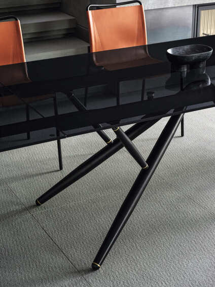 Прямоугольный и бочкообразный стол, фиксированный или раздвижной, со структурой и декоративными деталями из лакированной стали. Столешница из шпона, массива дерева, окоренного массива дерева, хрусталя, устойчивого к царапинам хрусталя, суперкерамики и супермрамора. Доступен в прямоугольной форме и в размерах: 200x75x116 250x75x120 250x75x100 250x75x106 200x75x120 160/200/240x75x90 190/240/290x75x100