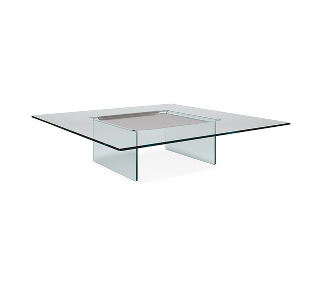 Журнальный столик из гнутого прозрачного стекла. Дополнительный лоток из нержавеющей стали. Доступен в квадратной форме и в размере: 140x140x33,5h