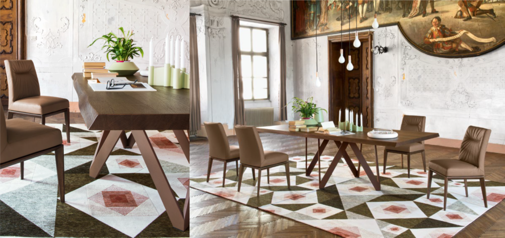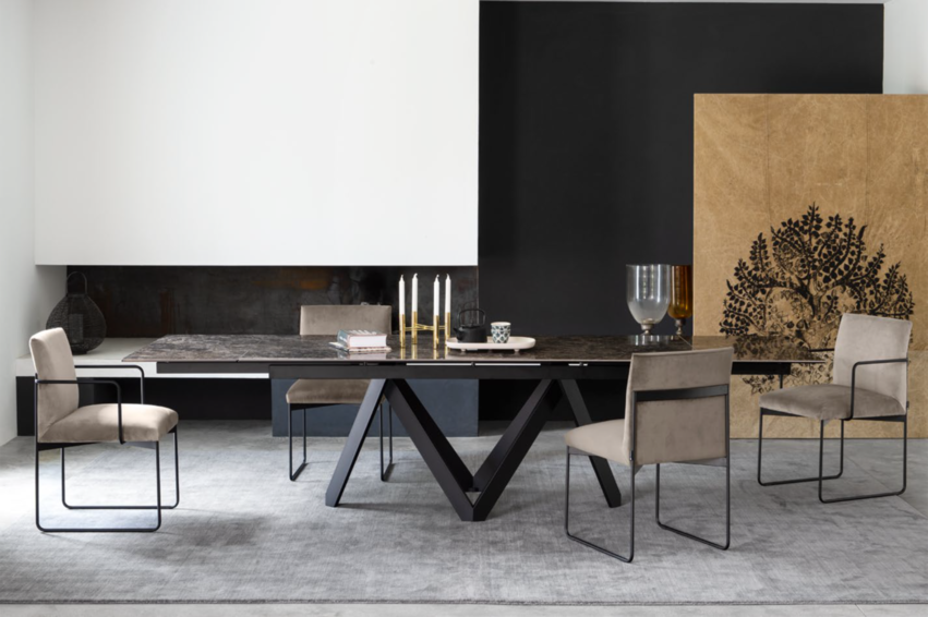 Элегантный стол Cartesio несет в себе черты индустриального дизайна и имеет впечатляющее металлическое основание в форме четырех независимых V-образных элементов