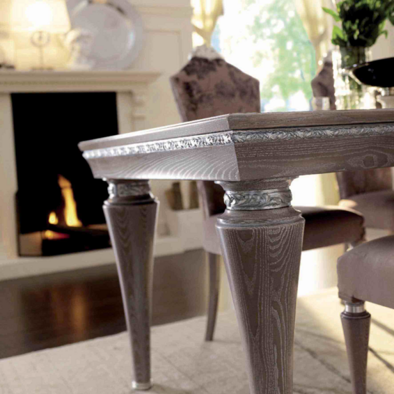 Дамасские ткани покрывают мягкие сиденья стульев, расставленных вокруг центрального прямоугольного стола. Спинки стульев и сужающиеся точеные ножки стола подчеркнуты классическими украшениями из сусального серебра.
