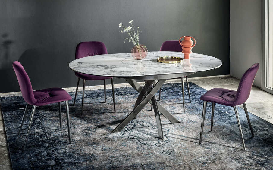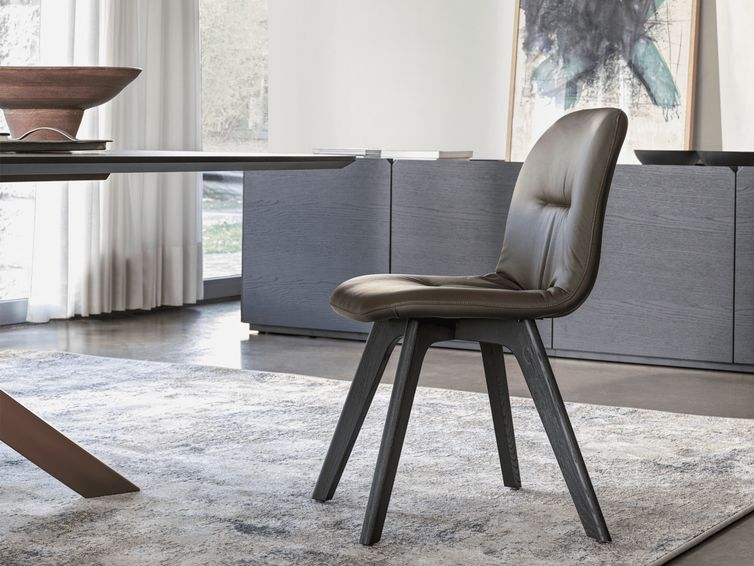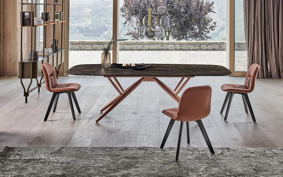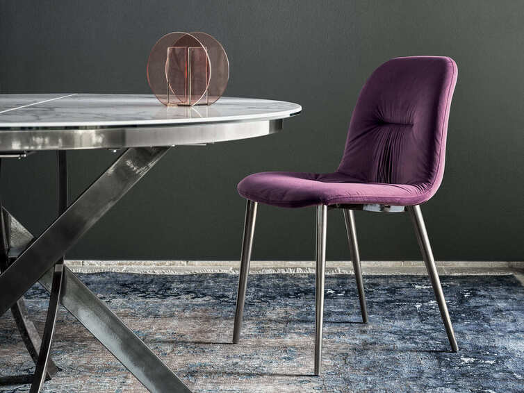 Стул с каркасом из цельного дерева и каркасом из стальных стержней. Ножки конической формы, поворотные, с колесами или без них, из лакированного алюминия. Доступен в размерах: 53х83/49х58 52х84/49х57 48х84/49х57 60х84/49х60