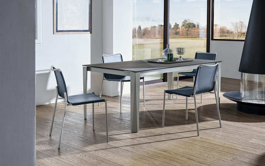 Раздвижной стол со структурой из лакированной стали, столешницей и надставкой из меламина, глянцевого или матового стекла, устойчивого к царапинам, SuperCeramic и SuperMarble. Доступен в прямоугольной форме и в размерах: 120/180x75x80 140/220x75x90 160/240x75x90 190/270x75x100