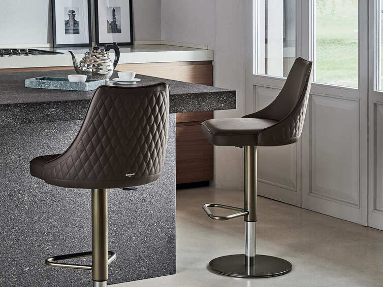 Табурет со стальной конструкцией, с полностью мягкой и мягкой оболочкой. Бордюр на выбор в тон или контрастного цвета. Также доступна версия со стеганой спинкой (только в обивке из водонепроницаемого нубука, экокожи и кожи премиум-класса). Доступен в размерах: 45х50х90/59 45х52х98/67 45х52х108/77