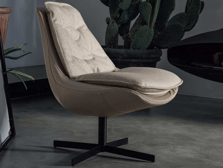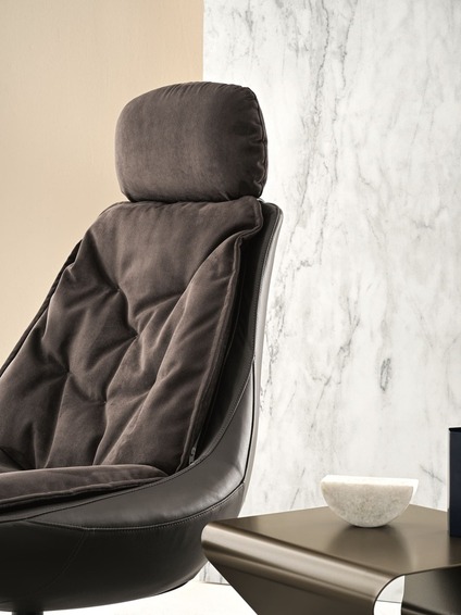Кресло со съемным чехлом и центральным поворотным основанием из хромированной или лакированной стали, корпус обтянут гибким полиуретаном холодного формования, негорючий, стеганые подушки обтянуты экокожей, экокожей премиум-класса, техническим бархатом, тканью Mambo и Lulù, водонепроницаемым нубуком, водонепроницаемым набивной нубук, чистая натуральная шерсть, бархат, полевая ткань Kvadrat, ткань хвоста Kvadrat и кожа Premium