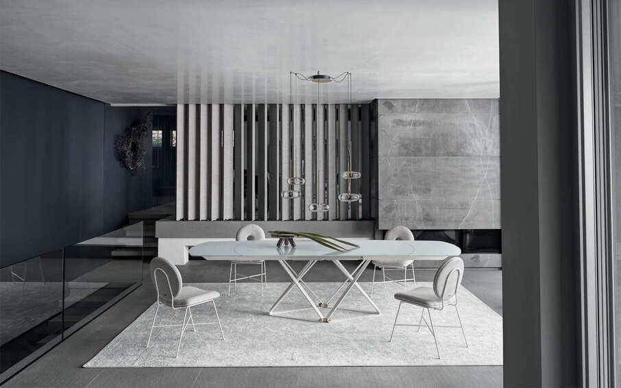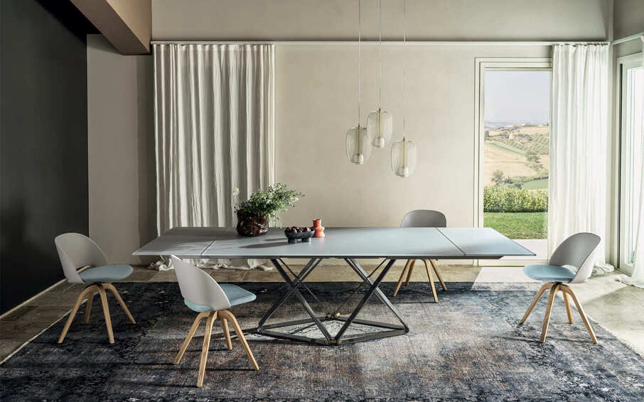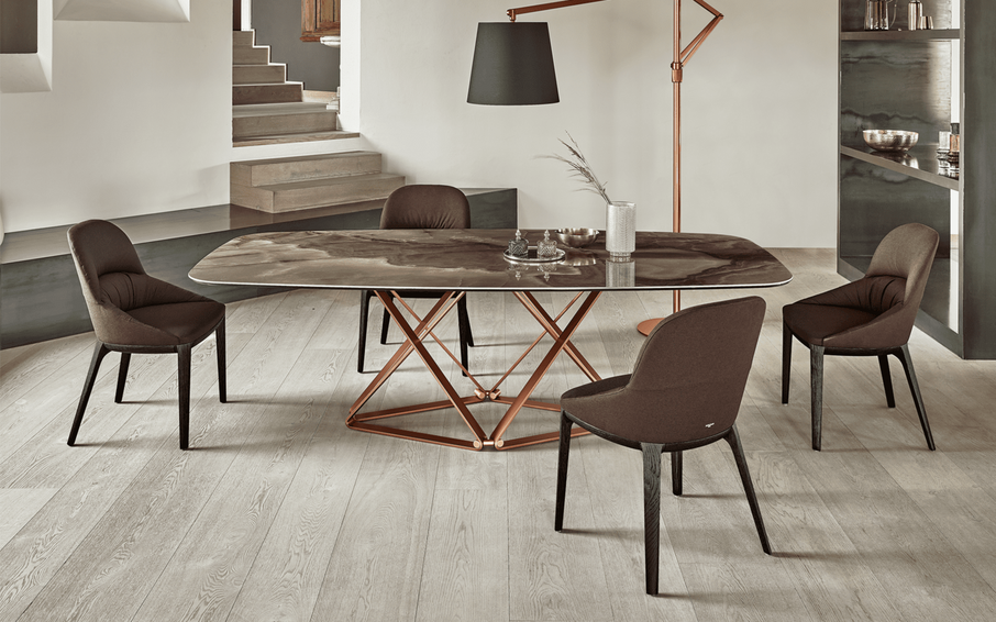 Неподвижный или раздвижной прямоугольный и бочкообразный стол со структурой и декоративными деталями из лакированной стали. Столешница из шпона, массива дерева, окоренного массива дерева, хрусталя, устойчивого к царапинам хрусталя, суперкерамики и супермрамора. Доступен в прямоугольной форме и в размерах: 200х75х116 250х75х120 170/210/250x75x106 200/250/300x75x106 200x75x100 200x75x106 250x75x100 160/200/240x75x90 190/240/290x75x100 190/240/290x75x106