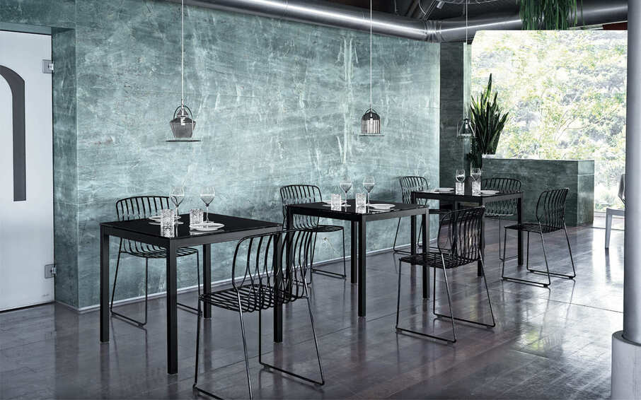 Неподвижный стол со стальной конструкцией. столешница из меламина, устойчивого к царапинам Unicolor, хрусталя и устойчивого к царапинам хрусталя. Доступен в прямоугольной и квадратной форме и в размерах: 80х75х80 120х75х80 140х75х80 160х75х80