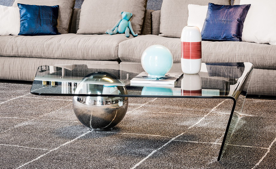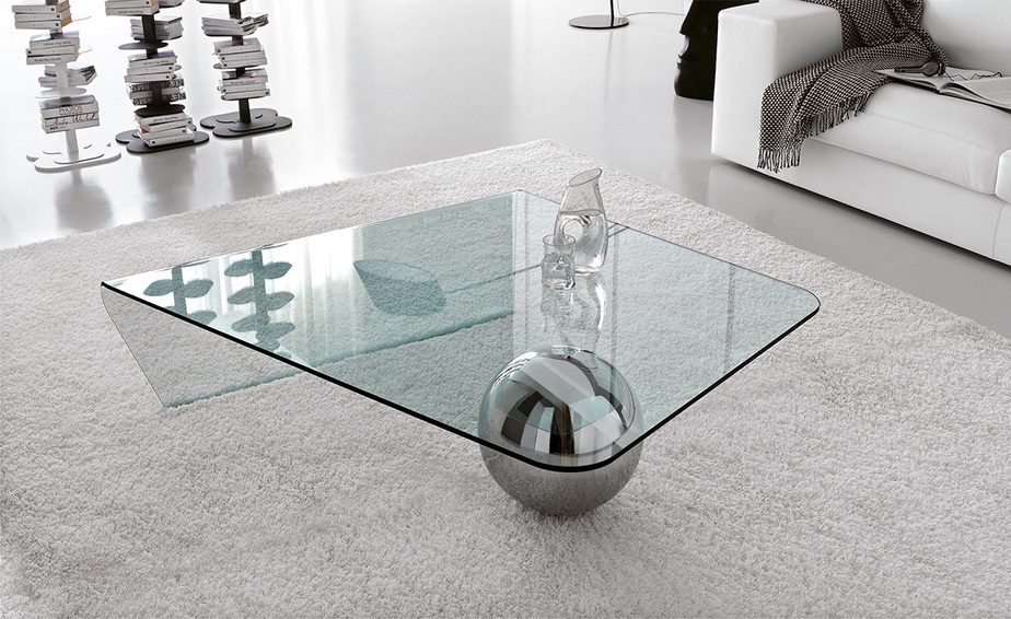 Журнальный столик с изогнутой столешницей из прозрачного стекла, сферой из блестящей стали или травертина Доступен в размерах: 130x70x36h 140x120x36h