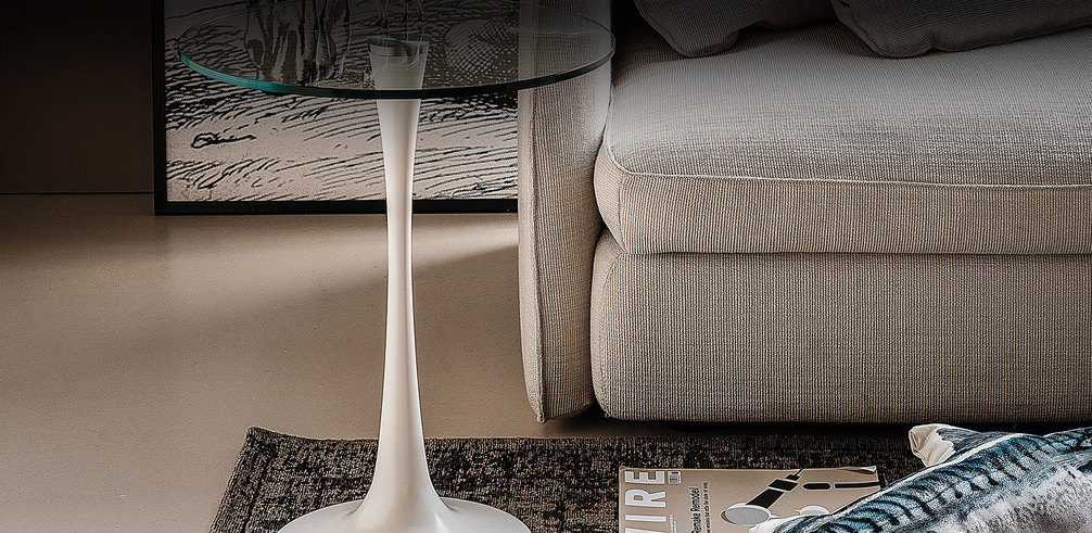 Журнальный столик с белой или черной жесткой полиуретановой основой. Столешница из прозрачного стекла или белого или черного лакированного МДФ. Доступен в круглой форме в размерах: ø45x56h ø55x56h
