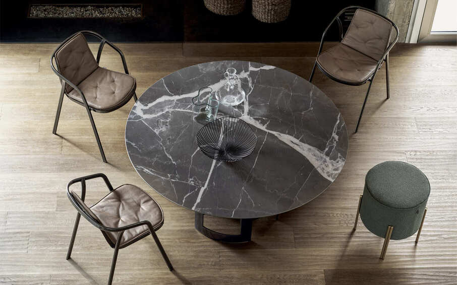 Неподвижный круглый стол со структурой браслета из лакированной стали со стандартной столешницей из шпона, глянцевого хрусталя или устойчивого к царапинам хрусталя или кольцевой столешницей с центральной вращающейся столешницей из глянцевого хрусталя, матового стекла, устойчивого к царапинам, или супермрамора. Доступен в прямоугольной форме и в размерах: Ø 150х75 Ø 180х75