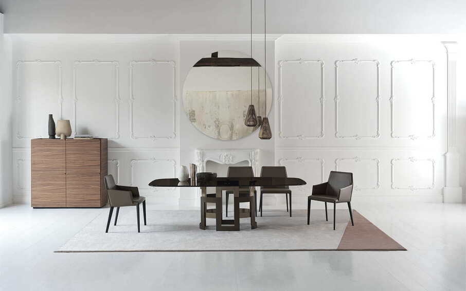 Стол с эллиптической, бочкообразной или прямоугольной столешницей, фиксированный или раздвижной из шпона, массива дерева, массива дерева с окоренением, глянцевого хрусталя, матового стекла, устойчивого к царапинам, SuperCeramic и SuperMarble