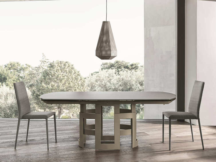 Стол с эллиптической, бочкообразной или прямоугольной столешницей, фиксированный или раздвижной из шпона, массива дерева, массива дерева с окоренением, глянцевого хрусталя, матового стекла, устойчивого к царапинам, SuperCeramic и SuperMarble. Структура браслета из лакированной стали. Доступен в прямоугольной форме и в размерах: 200х75х100 200х75х106 200х75х116 250х75х100 250х75х106 250х75х120