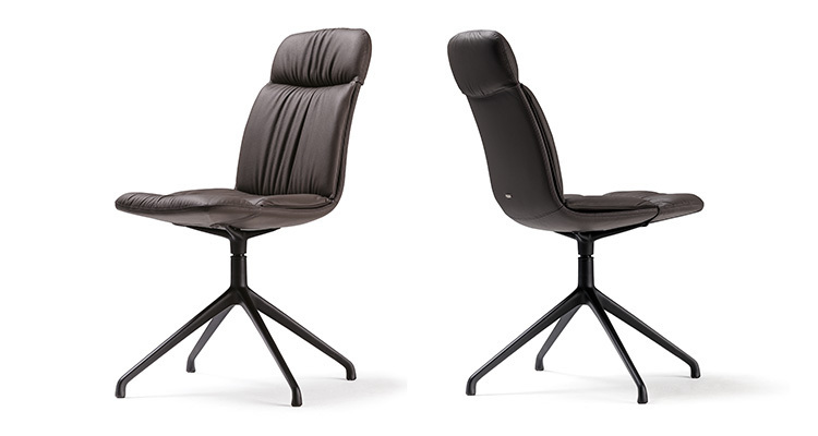 Вращающийся стул с 4-мя спицами из полированного алюминия или из лакированного алюминия с тиснением под графит, белый или черный цвет. Сиденье и спинка обиты тканью, синтетическим нубуком, синтетической кожей или мягкой кожей в соответствии с картой образцов. Крышка не съемная.