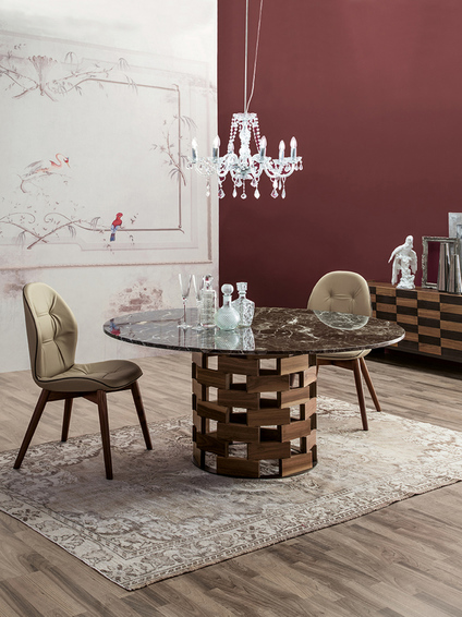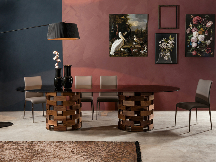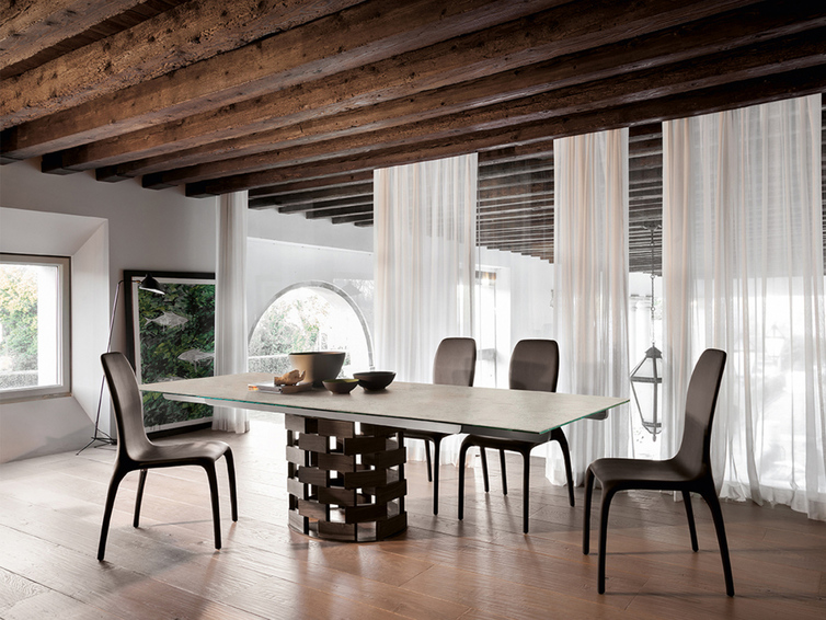 Colosseo & Big Colosseo Еще одна дань уважения самой Италии в форме и ощущении тепла и баланса. Основание из массива ореха или темного дуба для фиксированных или выдвижных столешниц из стекла, керамики и мрамора.