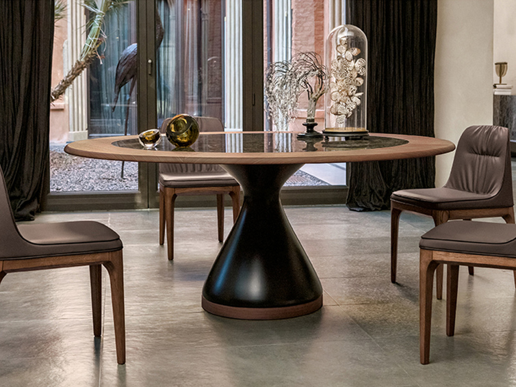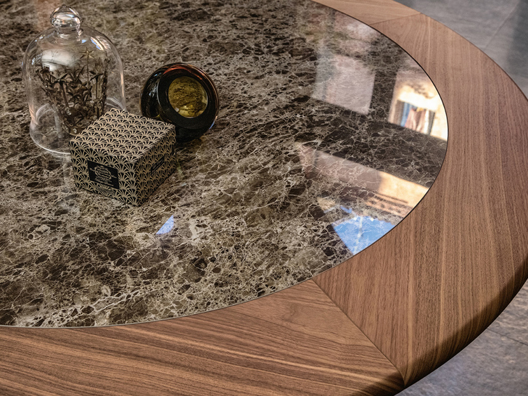 Неподвижный стол с основанием из лакированного мраморного агломерата и деревянной столешницей со вставкой из стекла или керамогранита