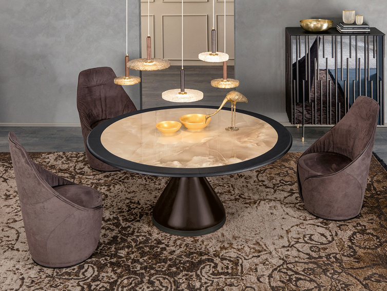 Неподвижный стол с основанием из лакированного мраморного агломерата и деревянной столешницей со вставкой из стекла или керамогранита. Также доступен с центральным подносом Lazy suzan. Добавьте еще одно место за столом, которое подходит Долли.