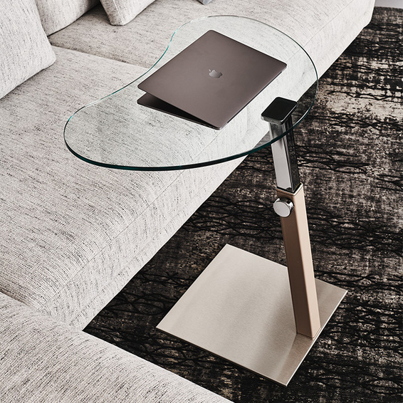 Приставной столик или блок ноутбука, регулируемые по высоте. Столешница из прямоугольного или фигурного прозрачного стекла толщиной 12 мм. Основание из сатинированной нержавеющей стали с хромированной ножкой или обтянуто кожей в соответствии с картой образцов. Доступен в размерах: 60x40x55/75h - R 80x50x55/75h - S