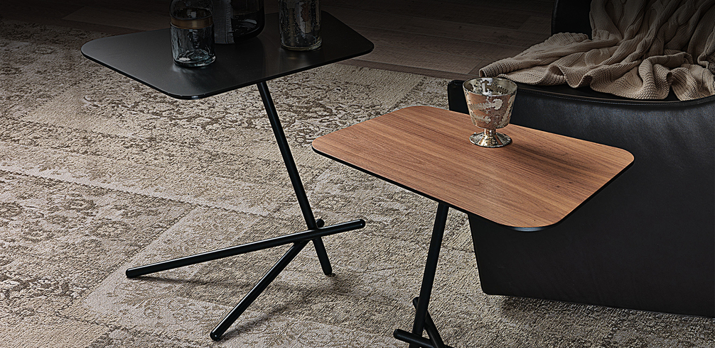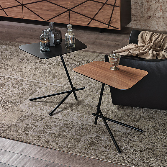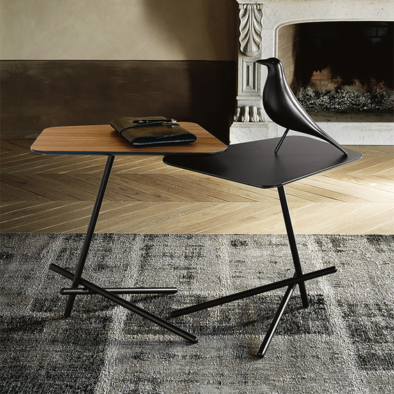 Журнальный столик с основанием из черной тисненой лакированной стали. Столешница из ореха Canaletto или сверхпрозрачного матового стекла, окрашенного в черный цвет. Доступен в размерах: 54x40x55h - A 54x40x50h - B