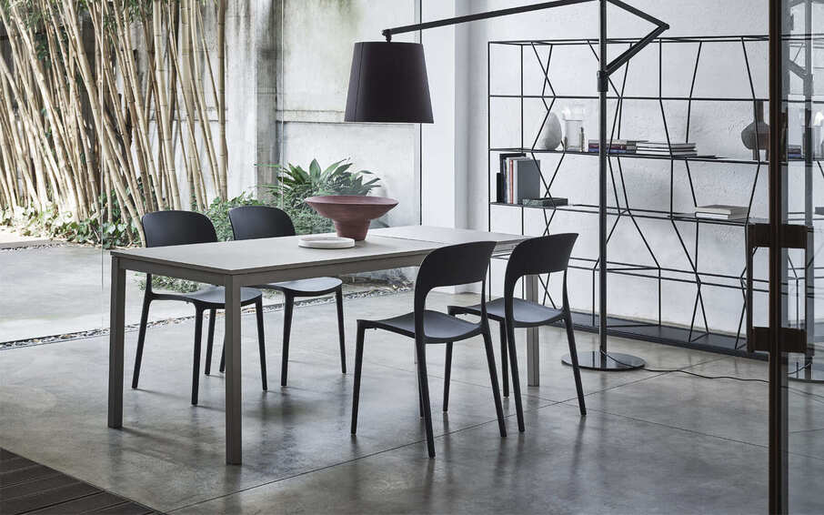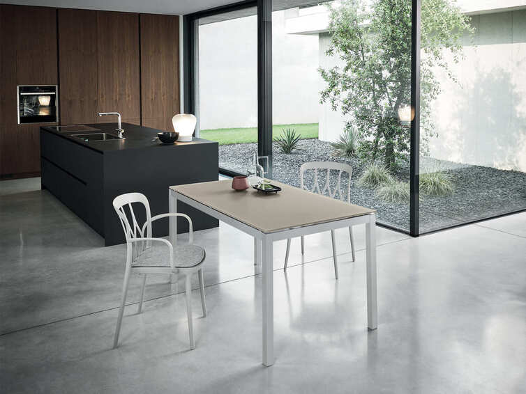 Раздвижной стол со структурой из стали, столешницей из меламина, устойчивого к царапинам одноцветного стекла, хрусталя и хрусталя, устойчивого к царапинам.