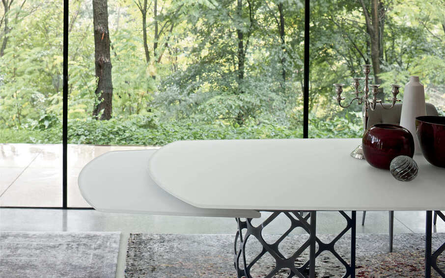 Неподвижный и раздвижной стол со структурой из лакированной стали. Столешница из массива дерева, векового массива дерева, массива дерева, шпона, натурального мрамора, хрусталя, хрусталя с защитой от царапин, суперкерамики и супермрамора. Доступен в прямоугольной и эллиптической форме и в размерах: 200х75х106 250х75х106 250х75х116 160/200/240x75x90 170/210/250x75x106 190/240/290x75x100/106 200/240/300x75x100/106