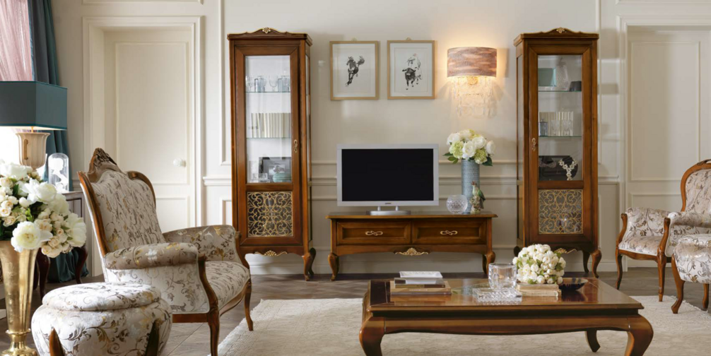 Дерево в сочетании с золотом играет ведущую роль в этой типично классической и изысканной гостиной. Журнальный столик имеет характерные и непредсказуемо сдержанные линии.